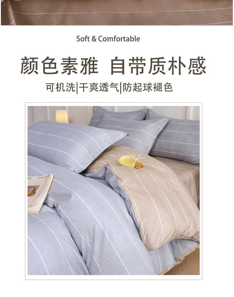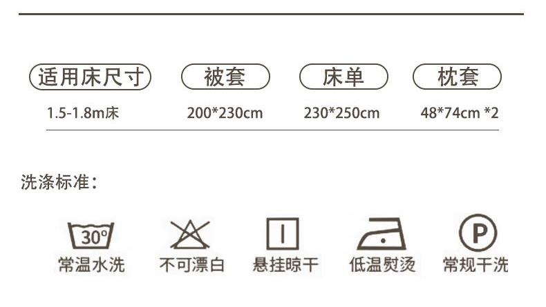 产品参数 面料:聚酯纤维 规格:被套200*230cm 床单230*250cm 枕套48*74cm*2只 产品卖点: 亲肤棉感聚酯纤维,柔软细腻不闷汗,耐磨抗皱好打理,机洗不变形 透气亲肤不压身,夜夜安睡不粘腻,柔软贴身,告别粗糙化纤感