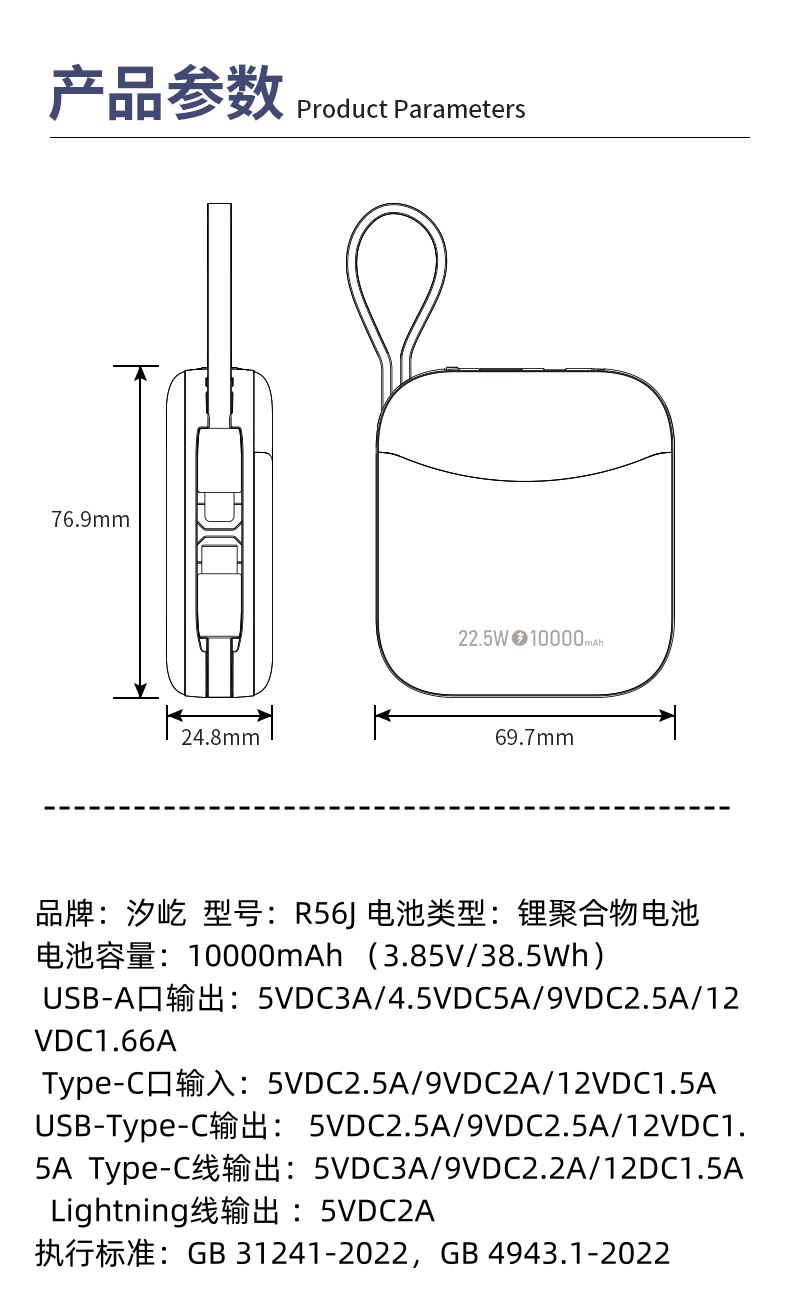 汐屹R56J迅捷自带线快充移动电源