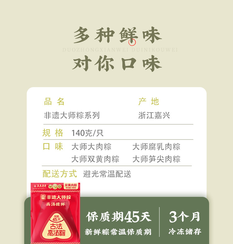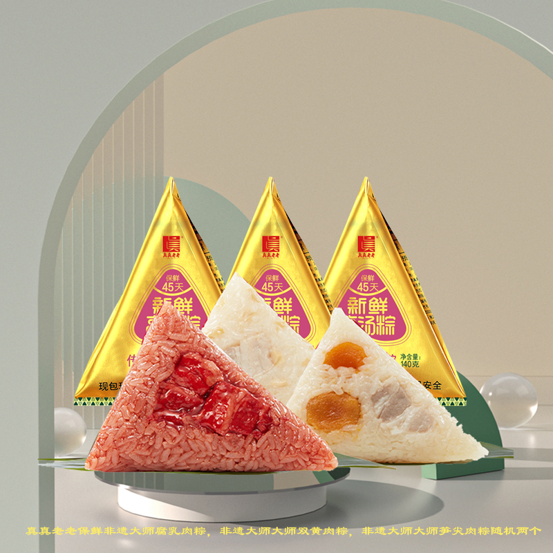 真真老老保鲜非遗大师腐乳肉粽,非遗大师大师双黄肉粽,非遗大师大师笋尖肉粽随机两个: 140g /包,常温保存保质期45天,冷冻保存3个月,包装尺寸14.5*21cm