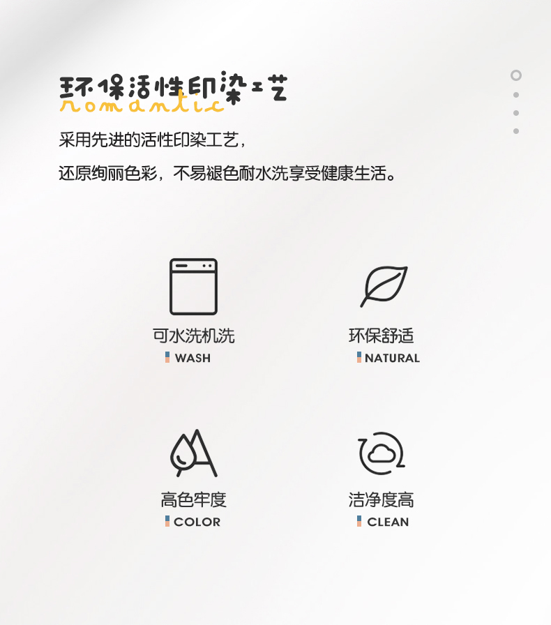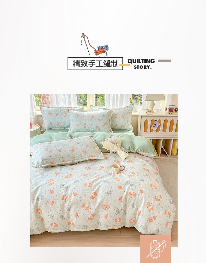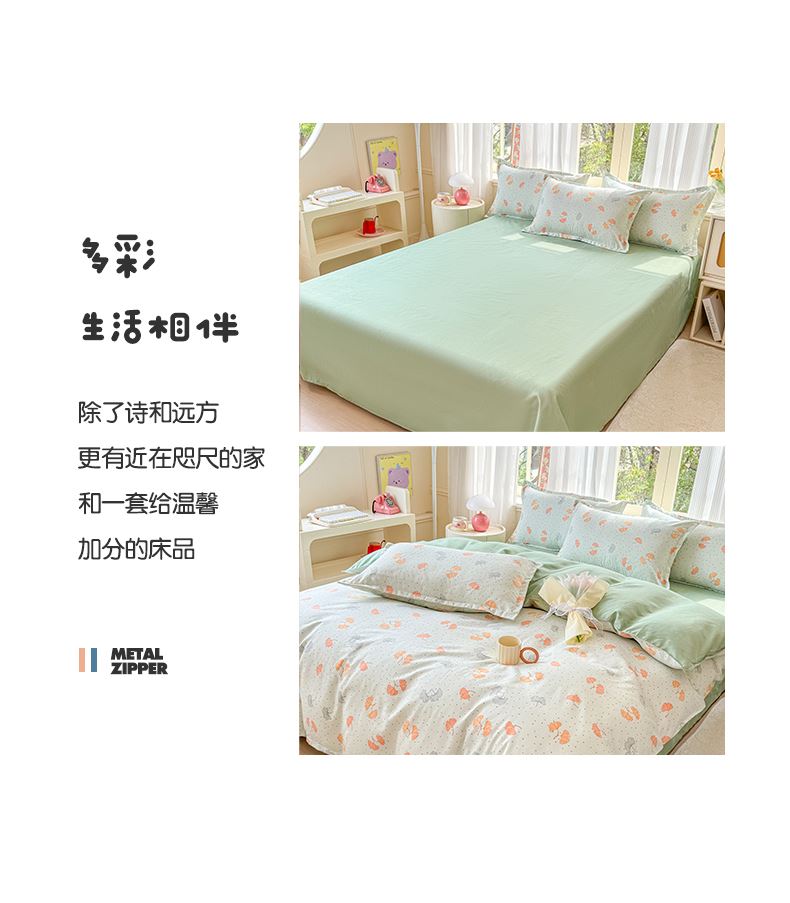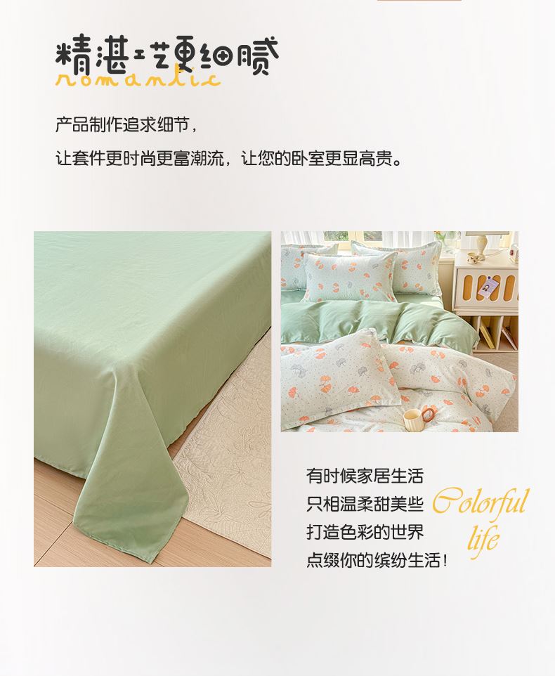 被套:200×230cm 床单:230×230cm 枕套:48×74cm 适用:1.5M-1.8M床 面料:磨绒(聚酯纤维) 印染工艺:环保印花 包装:精美手提盒 甄选柔肤棉面料,质地柔软 细腻,搭配时尙印花点缀柔和色彩的选择 手感舒适亲肤细腻 ,一起感受美好邂逅。