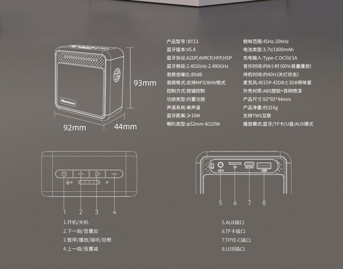 功能支持 :蓝牙/TF卡/USB/AUX音频线/收音机
