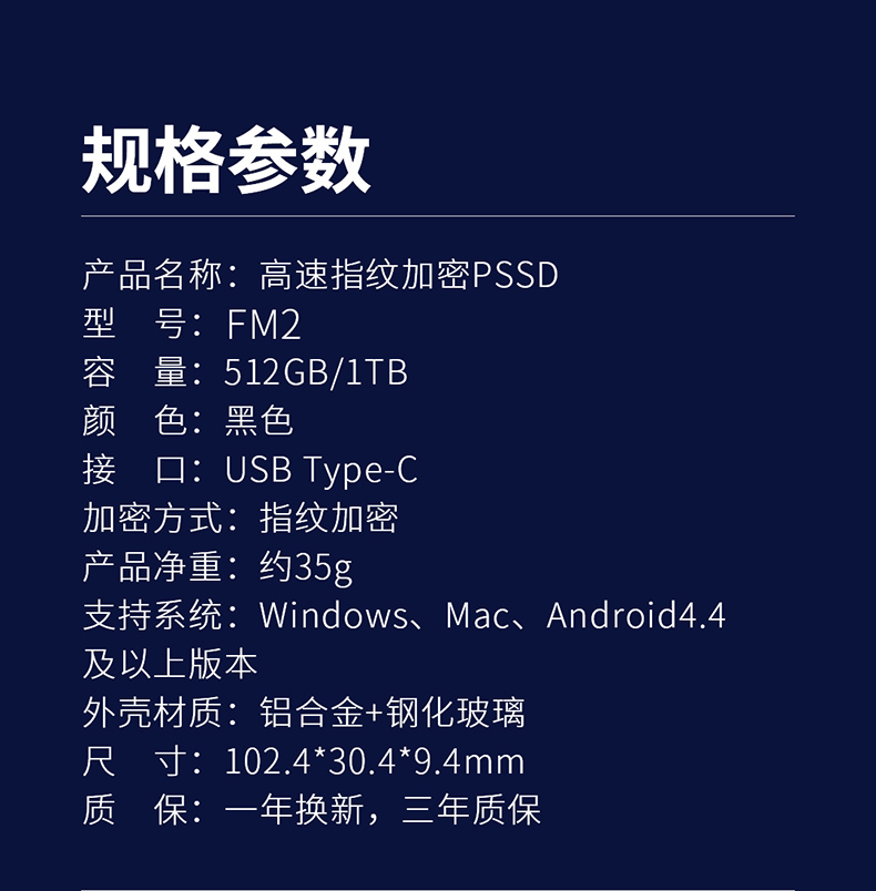 采用Type-C接口 芯片:固态级TLC颗粒高速传输 速度:420mb/s(写入速度) 530mb/s(读取速度) 电镀金属效果,美观大气 专属礼盒包装,送礼佳品 产品尺寸:102*30*9mm 包装尺寸:135*80*30mm 单品重量:35g