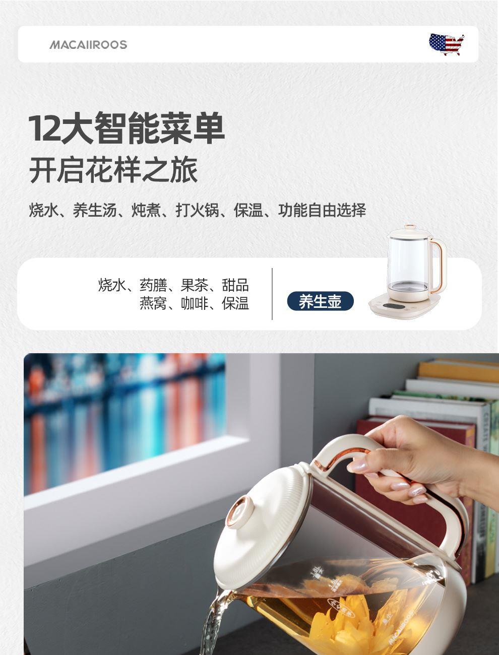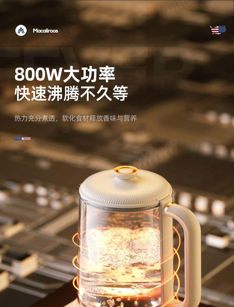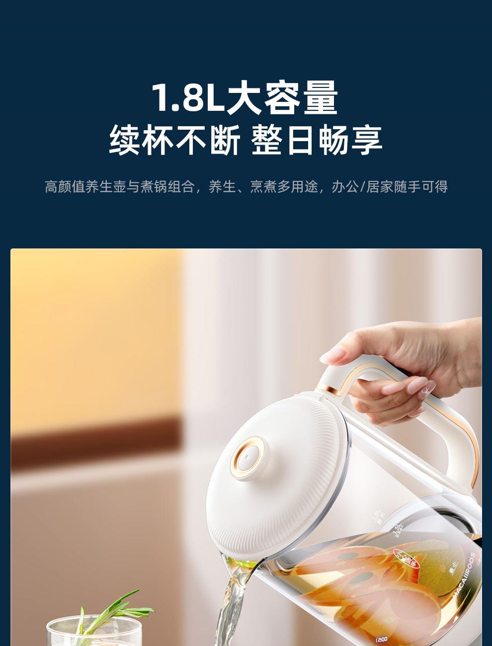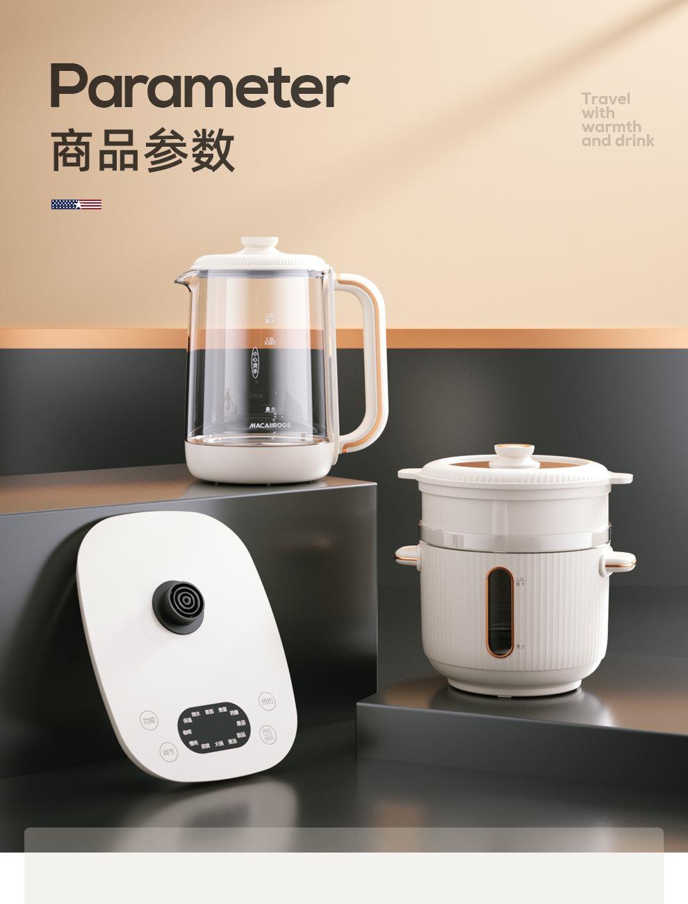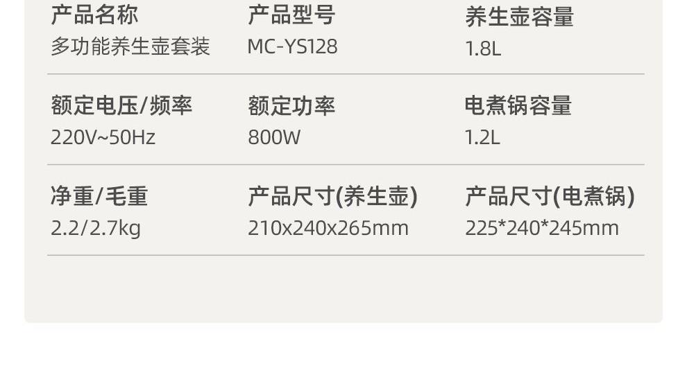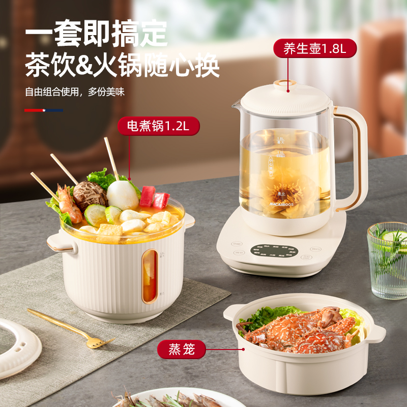 额定功率:800W 额定容量:1.8L养生壶/1.2L煮锅 额定电压:220V~ 额定频率:50Hz 产品净重:2.2kg 产品毛重:2.7kg 整箱重量:12.21kg 装 箱 数:4台/箱 一机多能12大菜单,养生、烹煮多用途,12h预约,自动保温; 一底两用分体式养生壶与煮锅组合,搭配独立蒸格,满足日常需求; 高硼硅玻璃壶身材质安全无异味,骤冷骤热不破裂; 触控操作玻璃触控面板,3位数码显示。