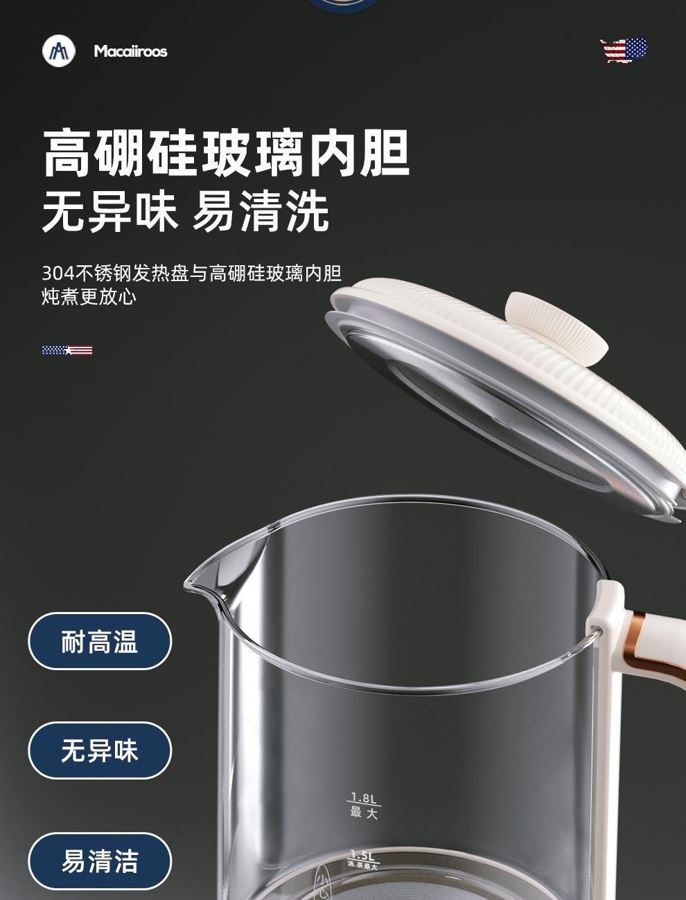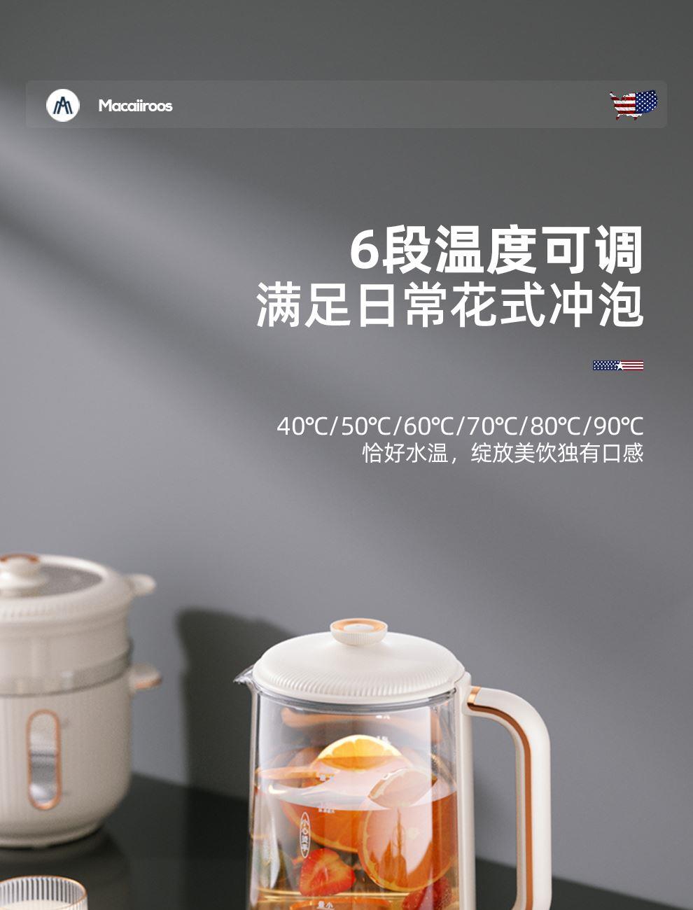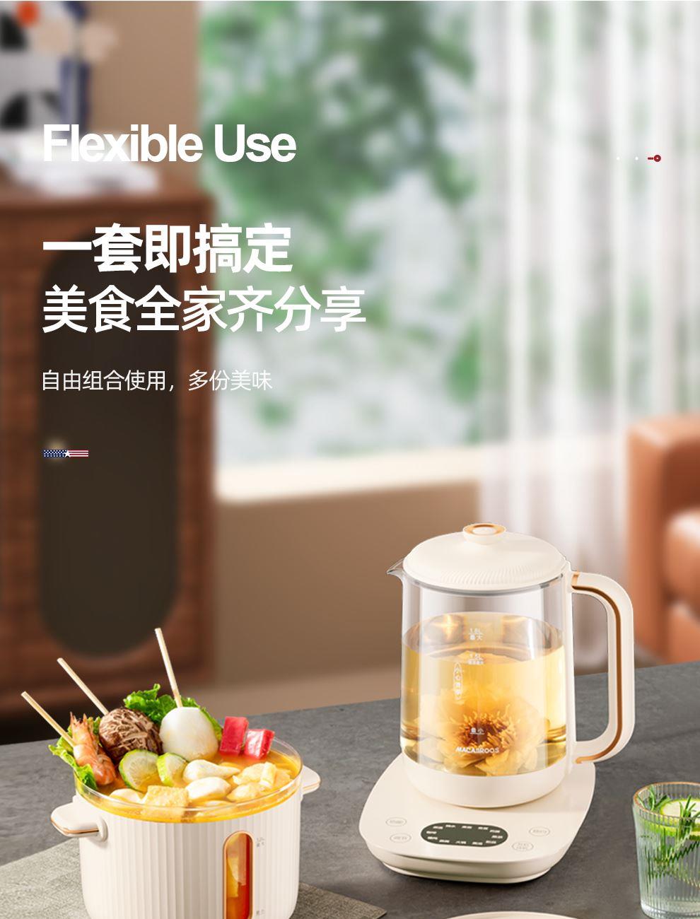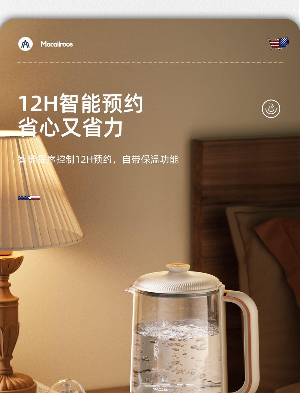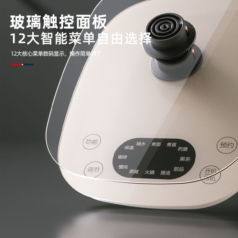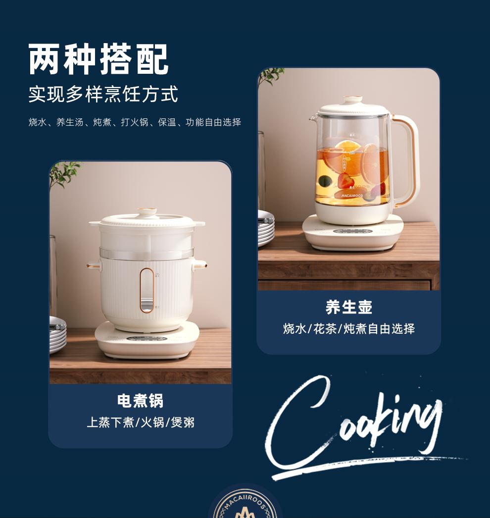 额定功率:800W 额定容量:1.8L养生壶/1.2L煮锅 额定电压:220V~ 额定频率:50Hz 产品净重:2.2kg 产品毛重:2.7kg 整箱重量:12.21kg 装 箱 数:4台/箱 一机多能12大菜单,养生、烹煮多用途,12h预约,自动保温; 一底两用分体式养生壶与煮锅组合,搭配独立蒸格,满足日常需求; 高硼硅玻璃壶身材质安全无异味,骤冷骤热不破裂; 触控操作玻璃触控面板,3位数码显示。