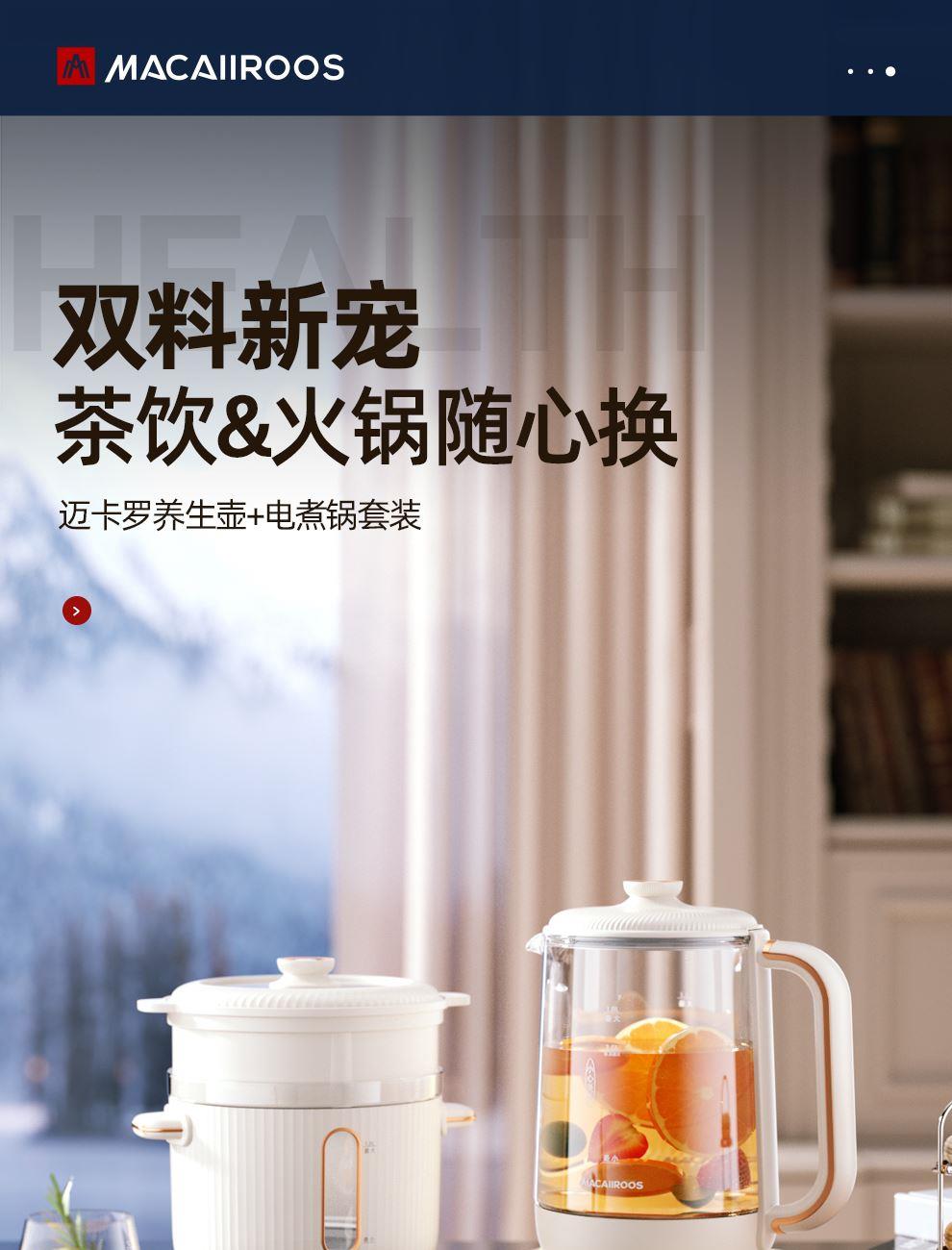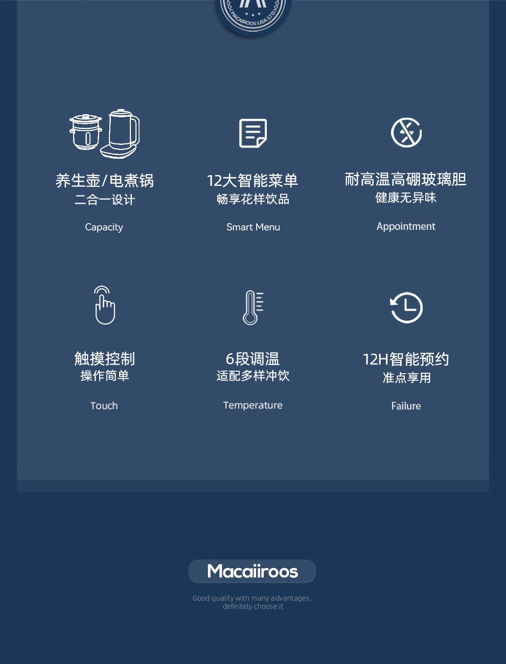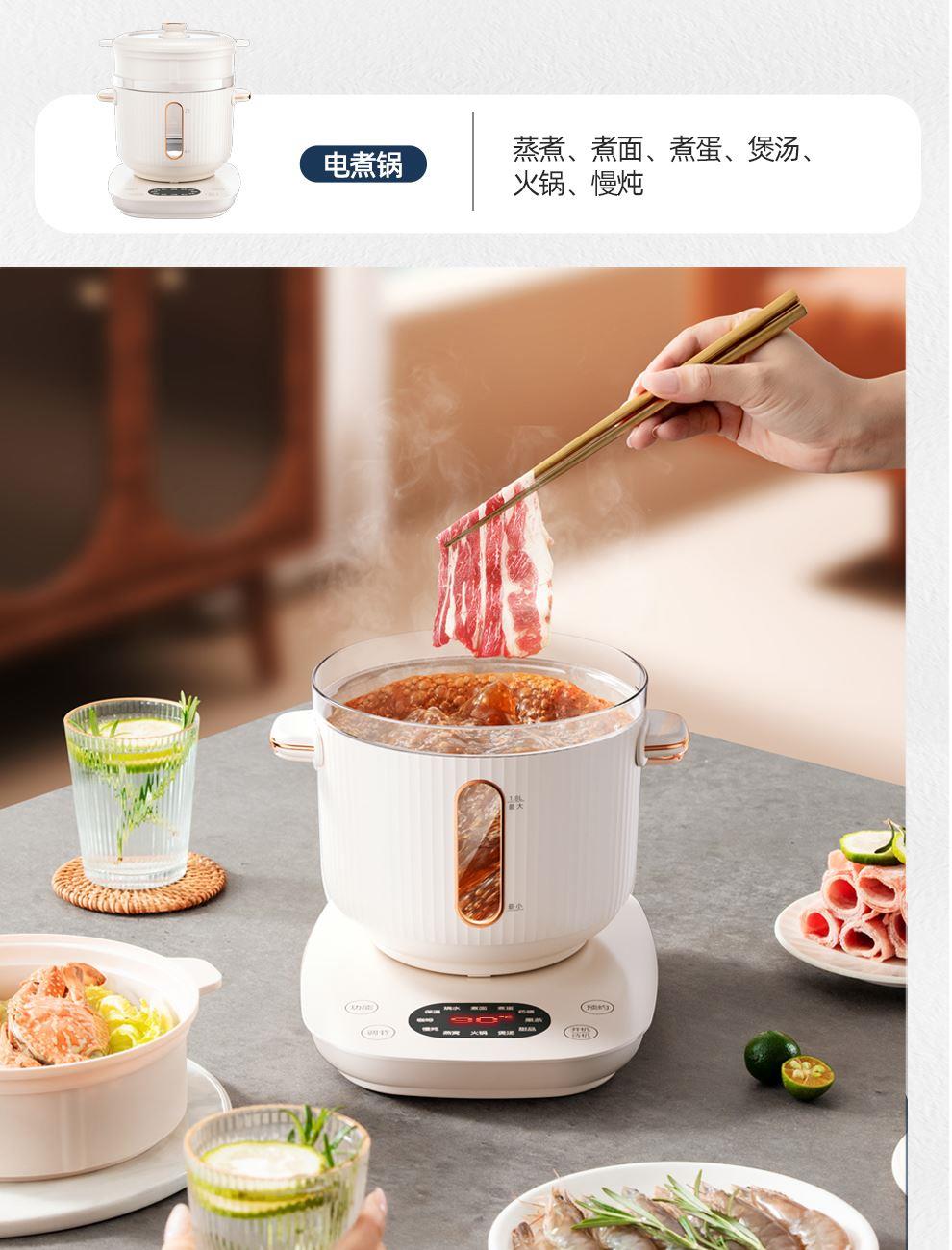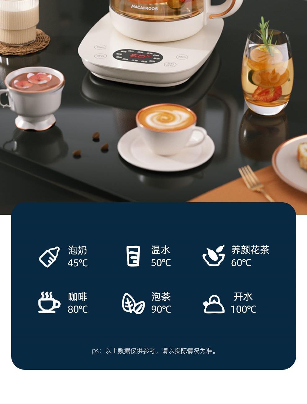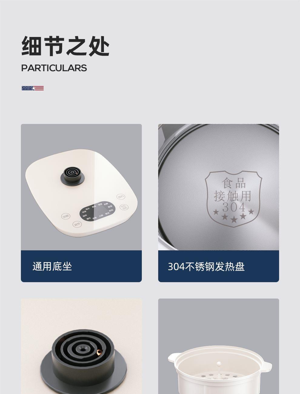 额定功率:800W 额定容量:1.8L养生壶/1.2L煮锅 额定电压:220V~ 额定频率:50Hz 产品净重:2.2kg 产品毛重:2.7kg 整箱重量:12.21kg 装 箱 数:4台/箱 一机多能12大菜单,养生、烹煮多用途,12h预约,自动保温; 一底两用分体式养生壶与煮锅组合,搭配独立蒸格,满足日常需求; 高硼硅玻璃壶身材质安全无异味,骤冷骤热不破裂; 触控操作玻璃触控面板,3位数码显示。