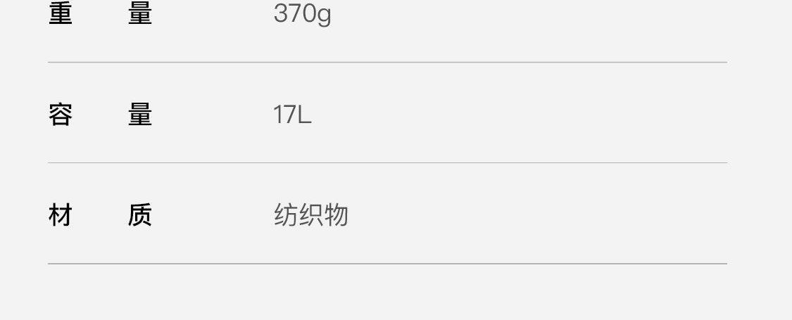 尺码:均码(41X20X22cm) 重量:370g 容量:17L 材质:纺织物 舒适手提带轻便不勒手 可拆卸背带多种背负方式 大容量主仓全天候透气 边仓收纳袋可折叠收纳 折叠设计便携不占地