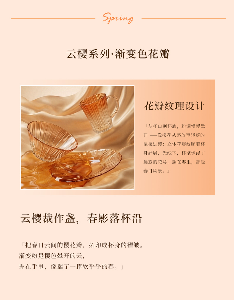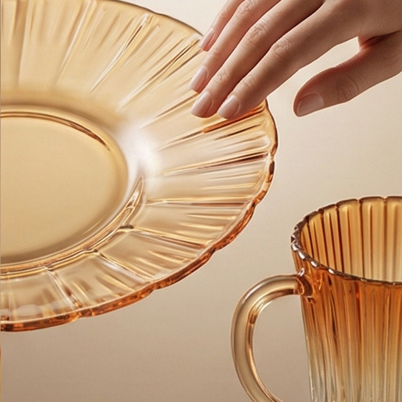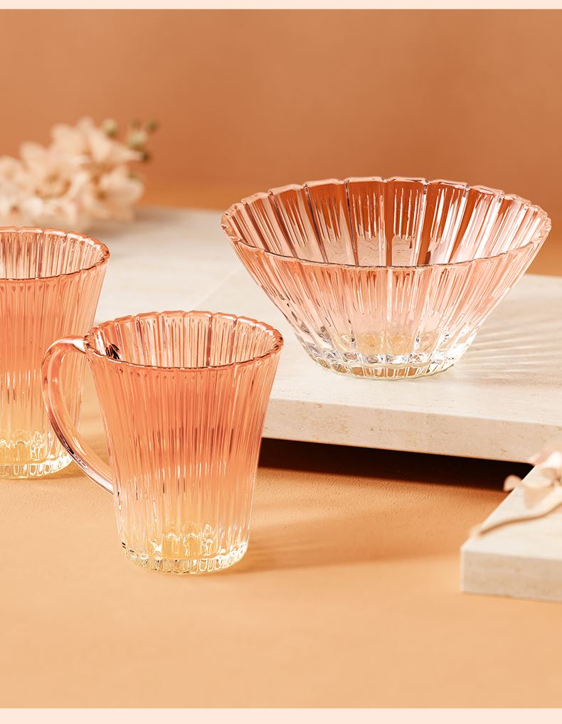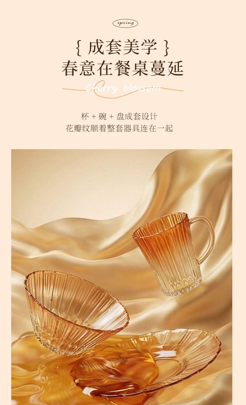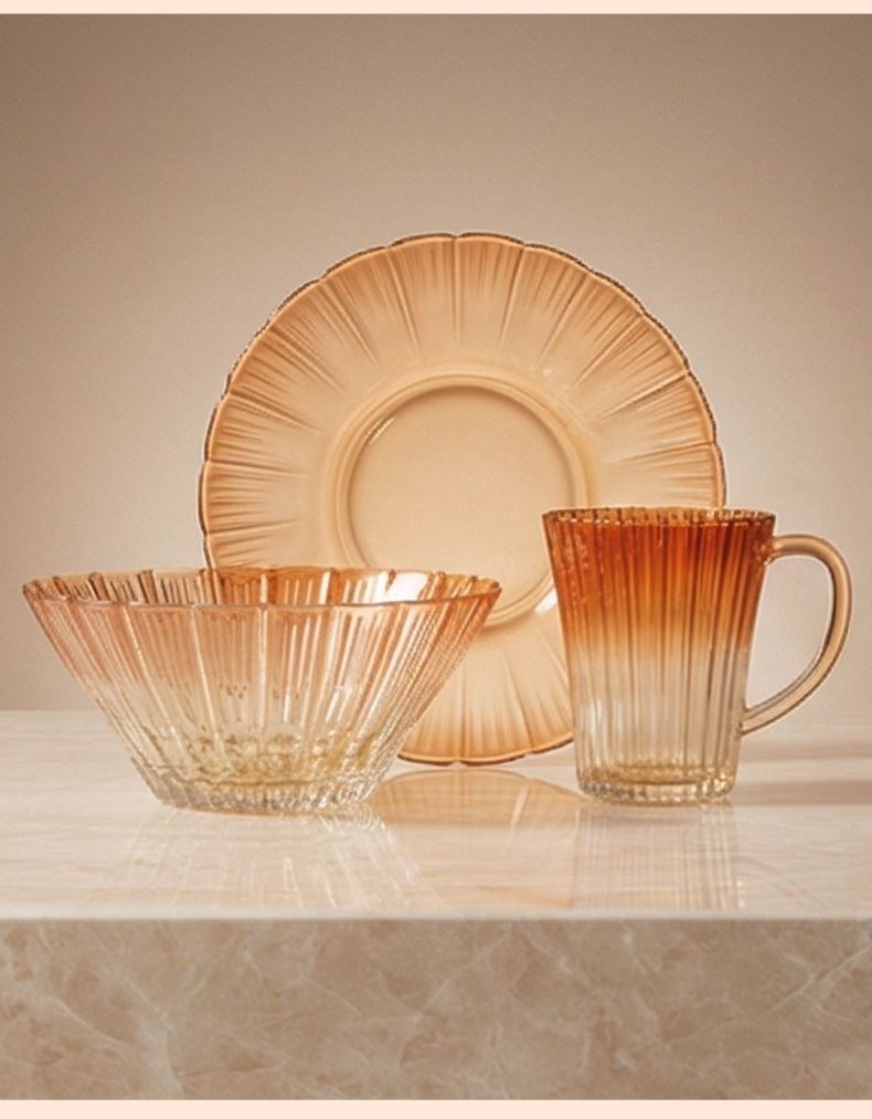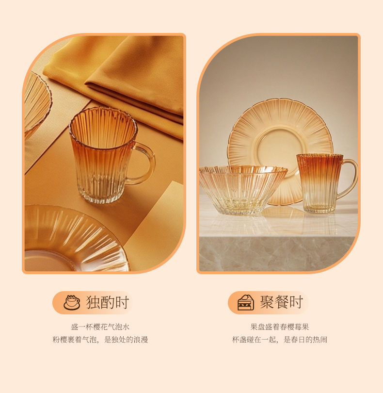适用温度:0°C-60°C 材 质:钠钙玻璃 产品参数:沙拉碗580ml、水杯310ml 彩盒尺寸:252*95*160mm 外箱尺寸:52*40*50cm 产品卖点:1.采用温暖的高颜值渐变玻璃工艺,色彩从深到浅过渡自然。 2.多元场景,点亮精致生活一套包含水杯、沙拉碗和点心盘,轻松驾驭各种日常需求。 3.高颜值玻璃餐具上市发售咯,复古竖纹搭配高 级琥珀渐变,自带轻奢氛围感。