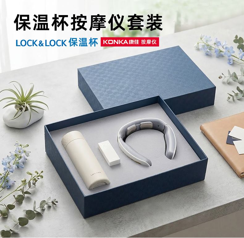 礼盒配置: 1、LOCK&LOCK 保温杯 316内胆 300ml 2、康佳按摩仪:9挡调速、自动调节护臂、8头EMS按摩 3、蓝色包装盒尺寸:328x263x75mm 4、蓝色手提袋尺寸:335x293x85mm 5、重量:27kg/箱