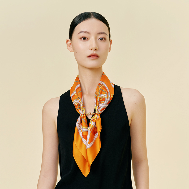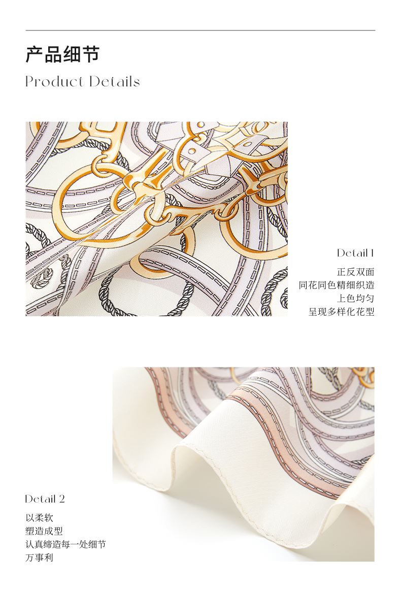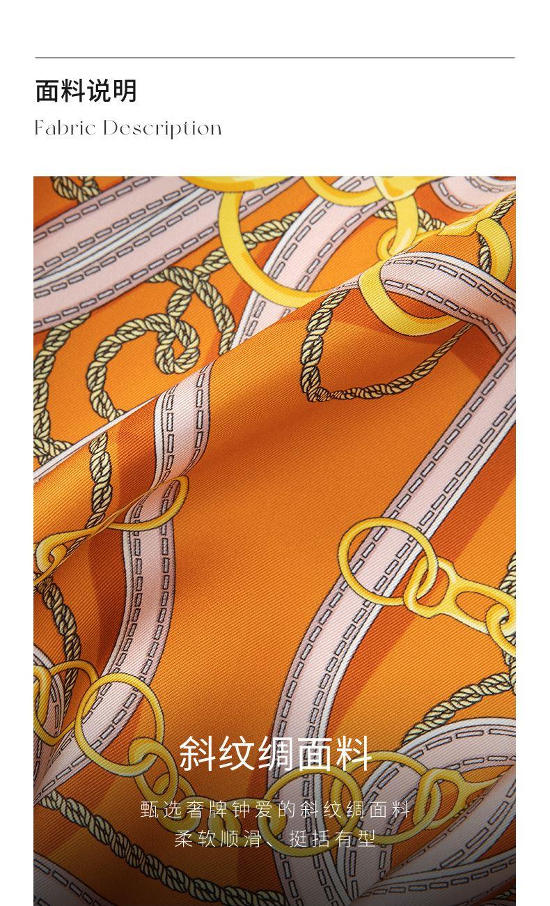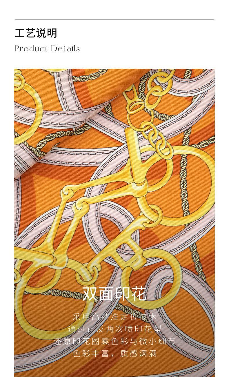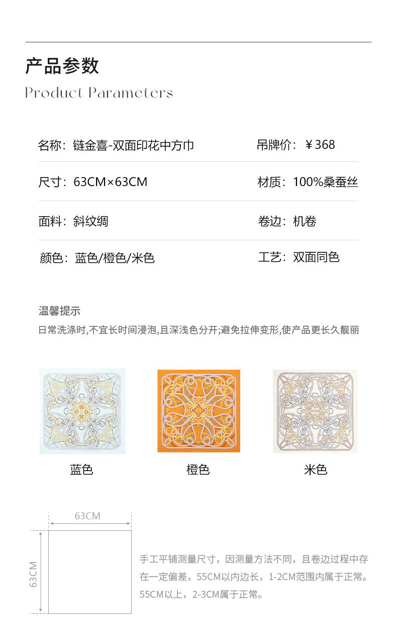 尺寸:63CM×63CM 材质:100桑蚕丝 面料:斜纹绸 卷边:机卷 颜色:蓝色/橙色/米色 工艺:双面同色