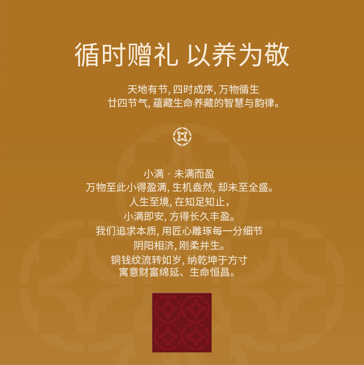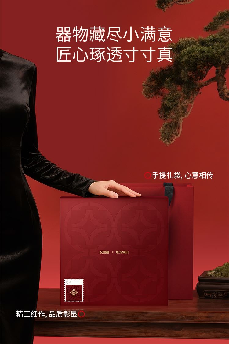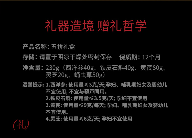 产品:东方颂230g五拼礼盒-小满 产品编码:016302 产品规格:230g(1.0-1.2西洋参40g,整朵黑灵芝20g、1.0-1.2黄芪80g、铁皮石斛40g,蛹虫草50g) 包装形式:礼盒装 产品保质期:12个月 产品条码:6977999772390 礼袋尺寸:360*360*95mm 礼盒尺寸:339*339*85mm 圆形金色铁罐:12*4.5cm