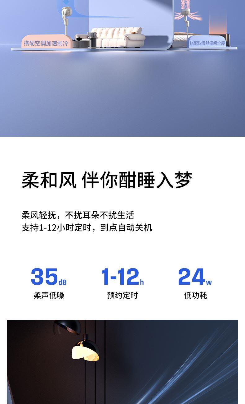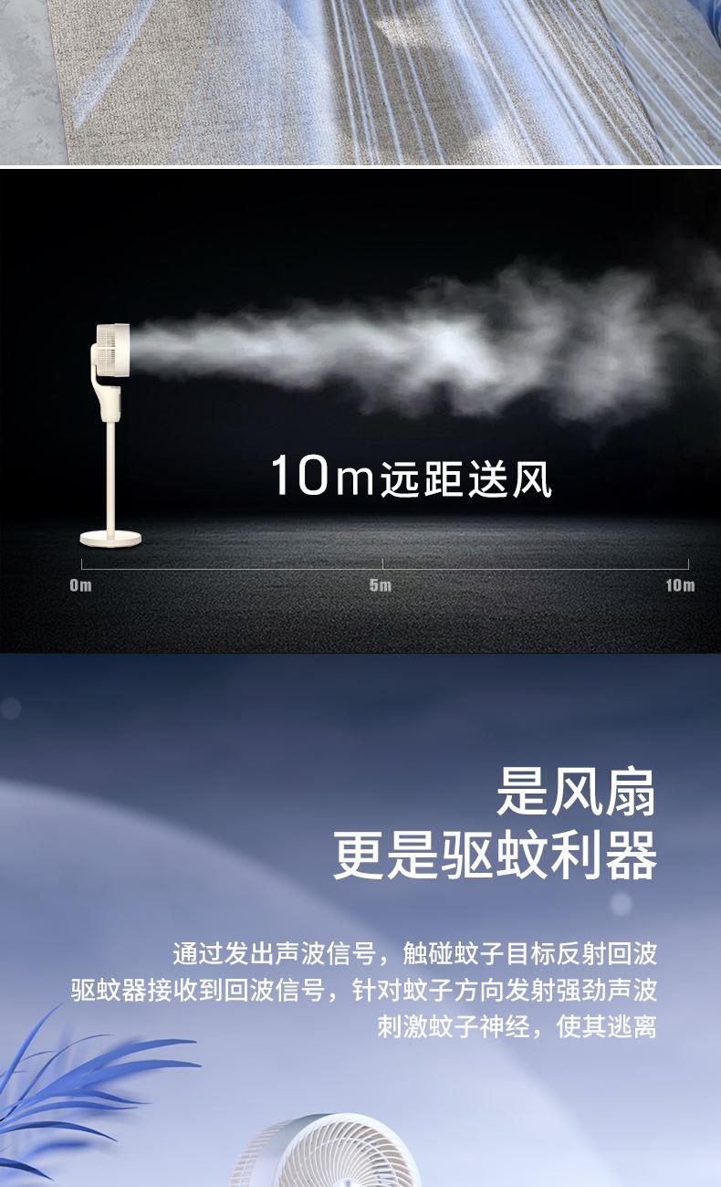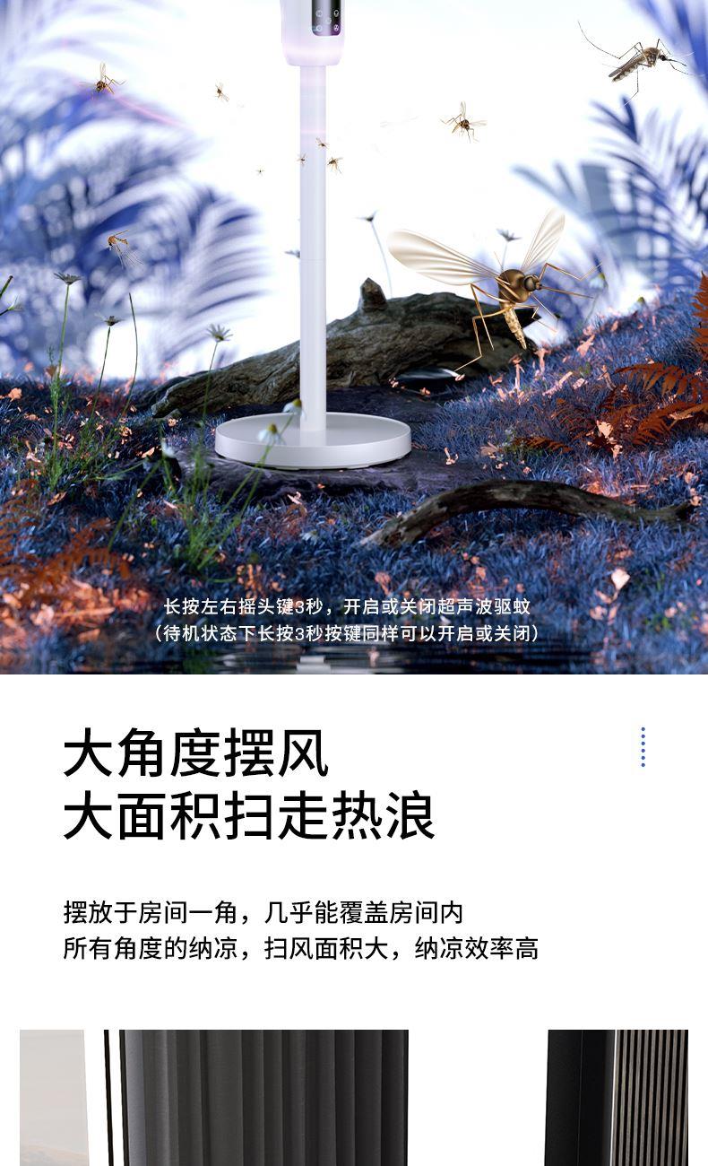 额定功率:35W 定时范围:12小时 档位:12档调节 控制方式:触控、遥控、语音、手机小程序 净重/毛重:4.4kg/5.4kg 产品尺寸:300*300*1070mm 1、首创超声波智能驱蚊,开机即开启; 2、12档风速调节,12小时预约定时,AI智能变频; 3、全自动3D遥头,上下90°,左右65°广域送风; 4、多种控制方式:触摸、遥控、小程序、AI智能语音交互; 5、自带记忆功能,隐藏式香熏盒,香随风远; 6、AI智能风,生态负离子净化,循环微气候; 7、高度可伸缩,台、立两用,满足不同摆放需求。 8、自带暖光小夜灯,静柔不刺眼