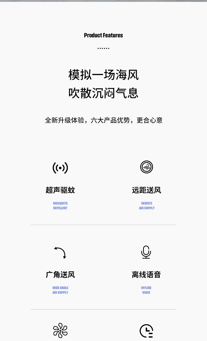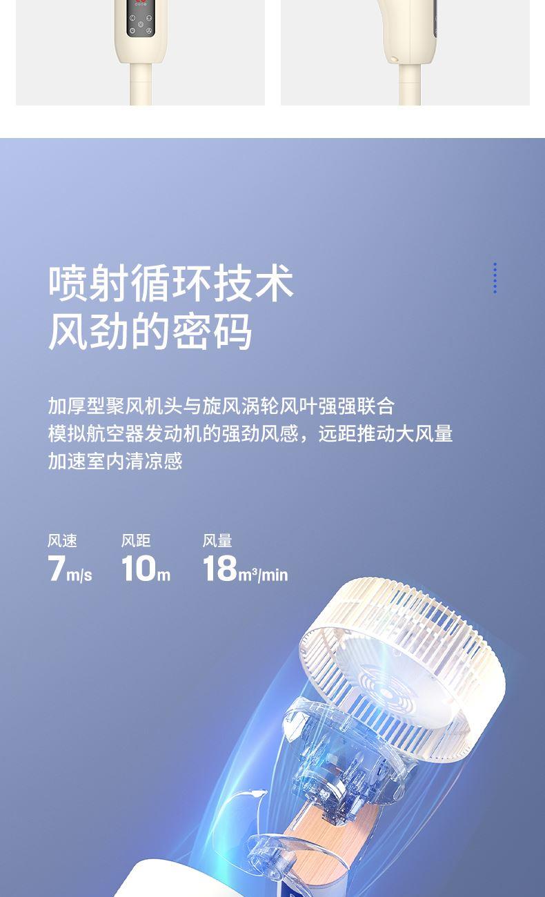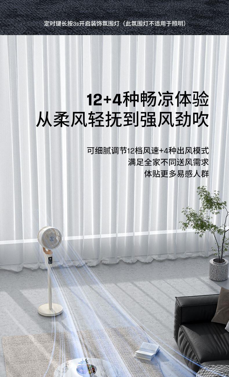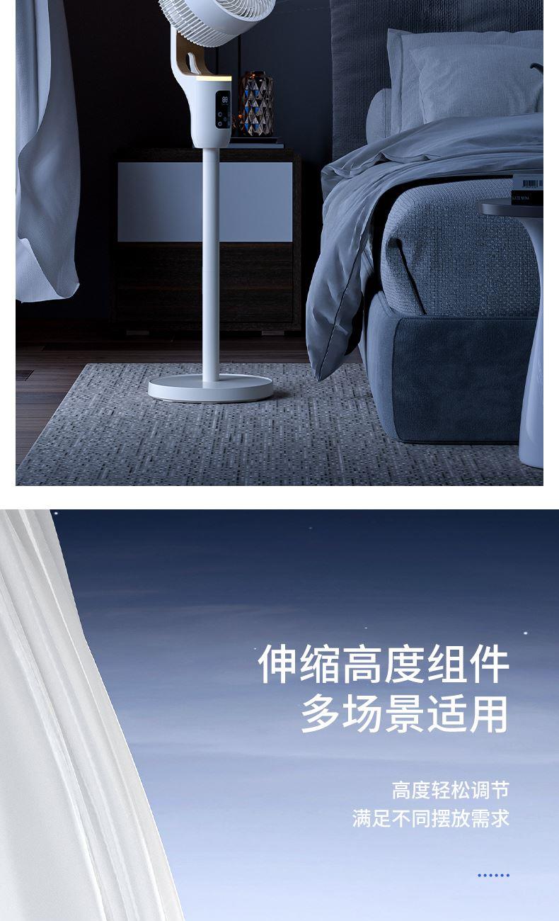 额定功率:35W 定时范围:12小时 档位:12档调节 控制方式:触控、遥控、语音、手机小程序 净重/毛重:4.4kg/5.4kg 产品尺寸:300*300*1070mm 1、首创超声波智能驱蚊,开机即开启; 2、12档风速调节,12小时预约定时,AI智能变频; 3、全自动3D遥头,上下90°,左右65°广域送风; 4、多种控制方式:触摸、遥控、小程序、AI智能语音交互; 5、自带记忆功能,隐藏式香熏盒,香随风远; 6、AI智能风,生态负离子净化,循环微气候; 7、高度可伸缩,台、立两用,满足不同摆放需求。 8、自带暖光小夜灯,静柔不刺眼