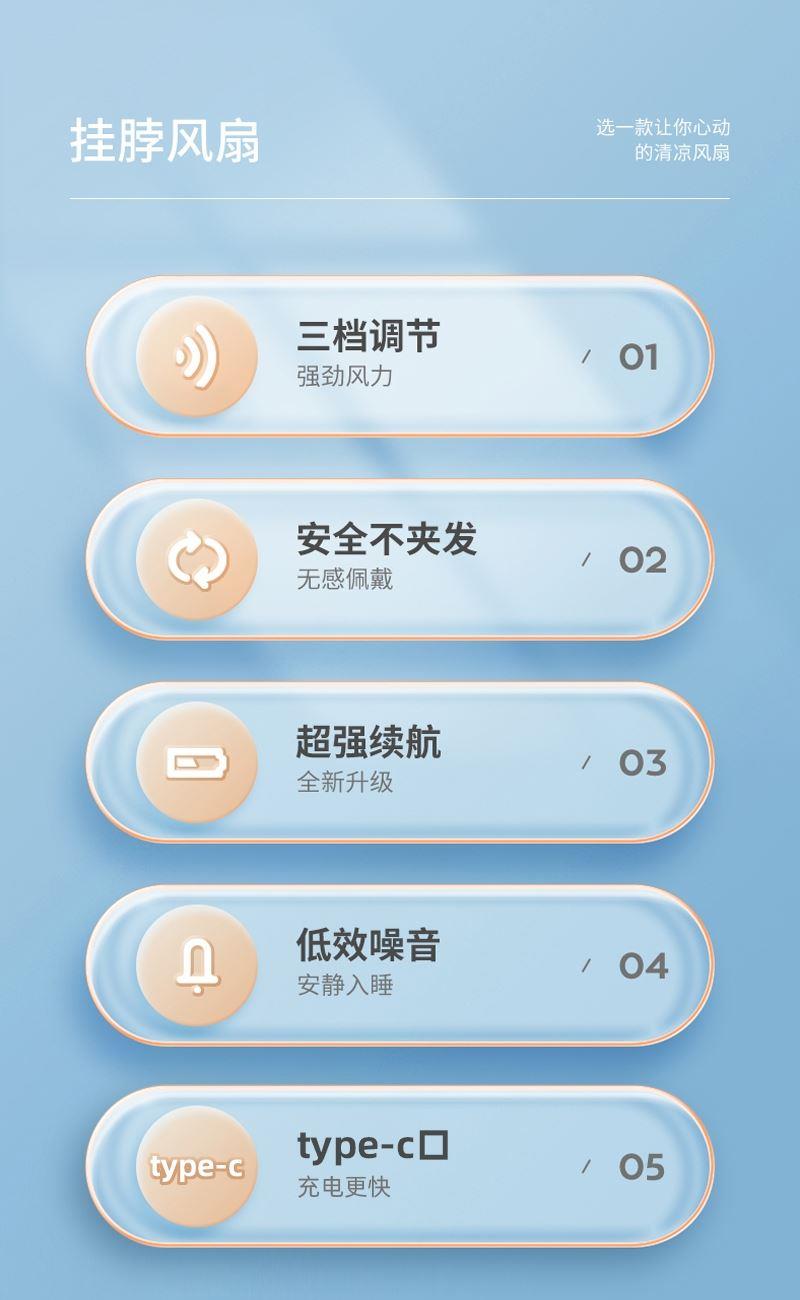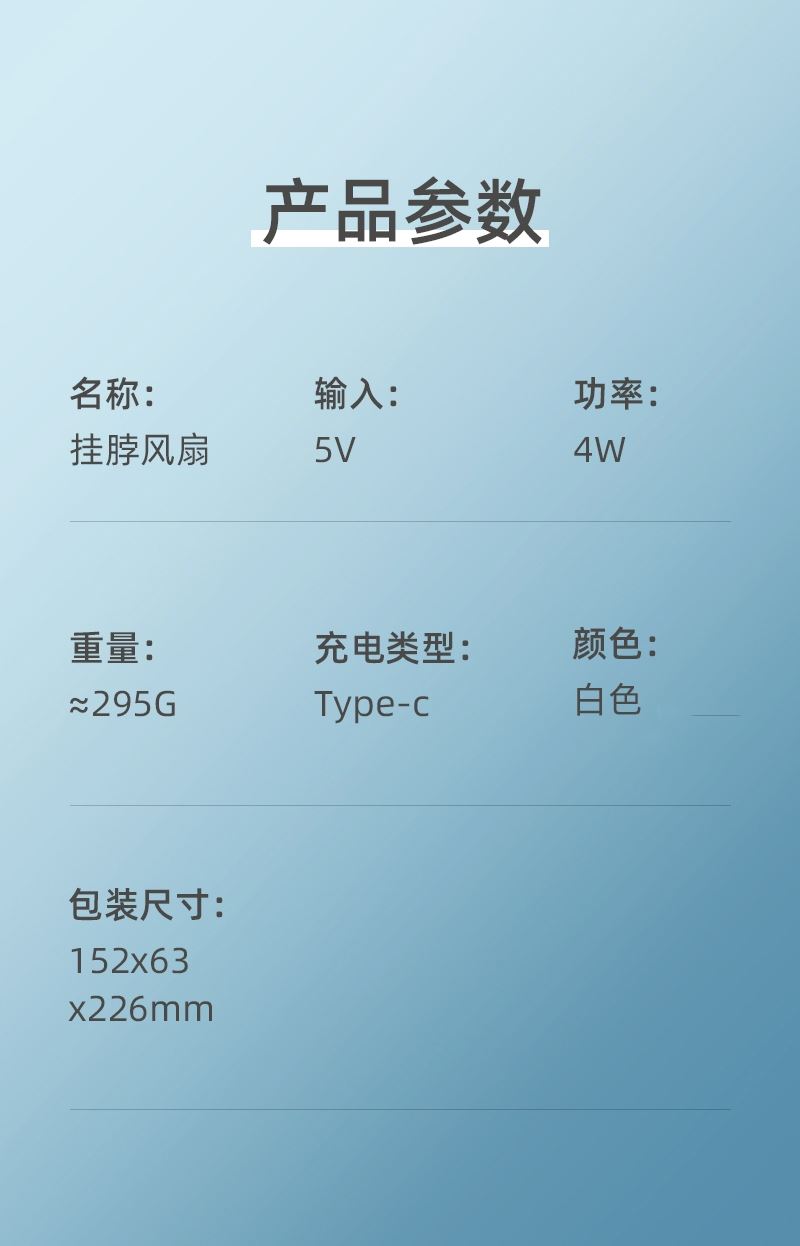 充电输入:5V/1.0A 功耗:5W 材料:ABS+PC+硅胶 风扇档位:三档 电池容量:1200mAh/3.7V 产品重量:295g 包装尺寸:152*63*226mm 产品颜色:白色 •隐藏式风叶不卷秀发,三档风力全域环绕,角度随意调节 不易断。