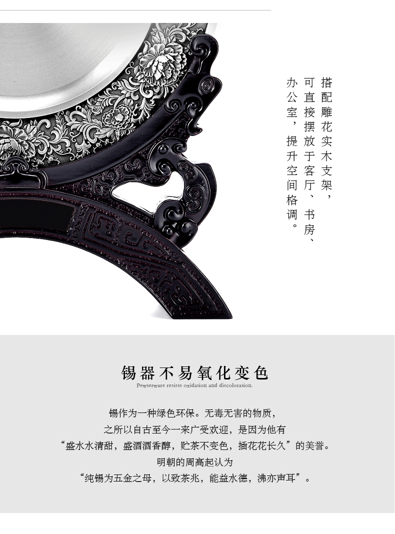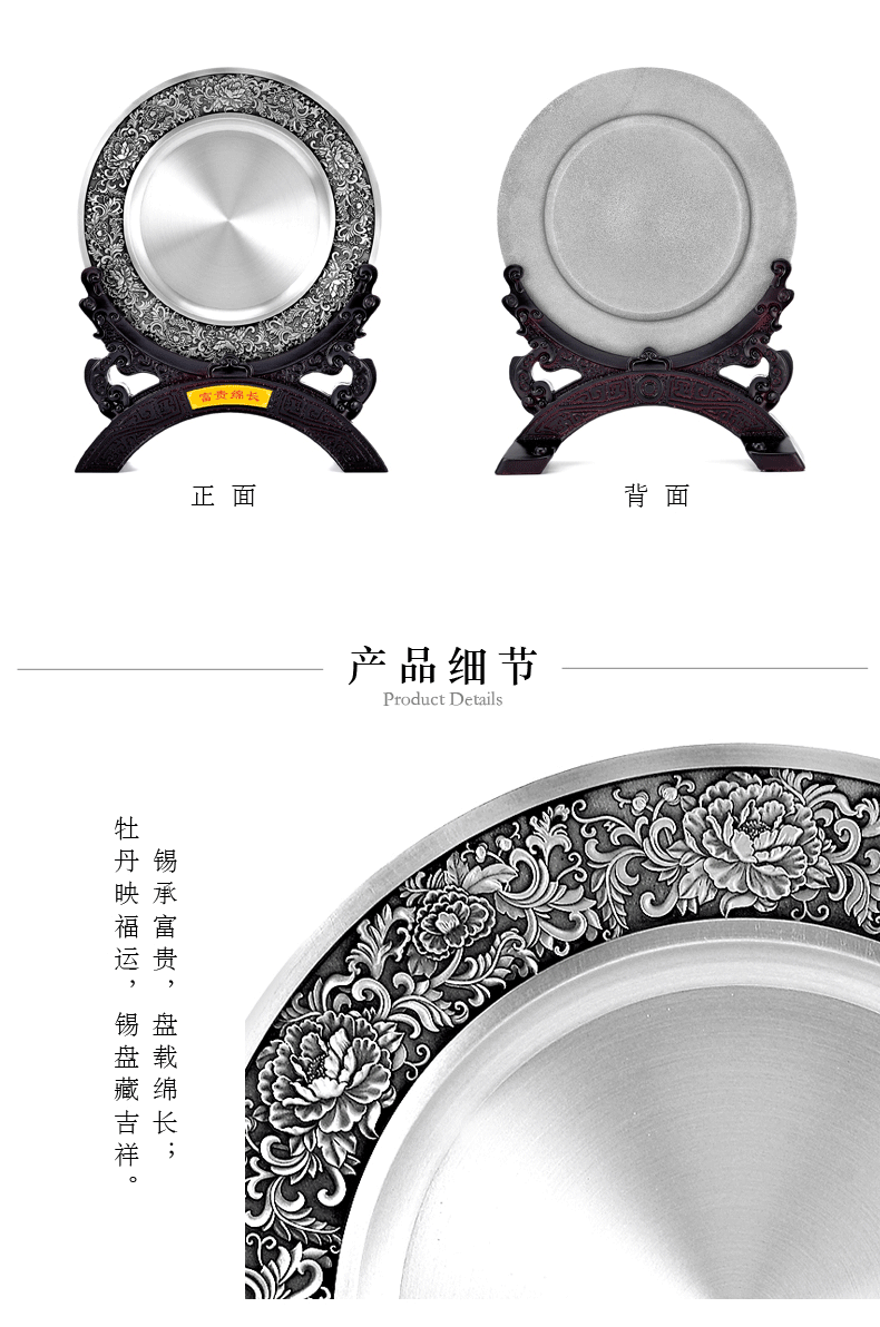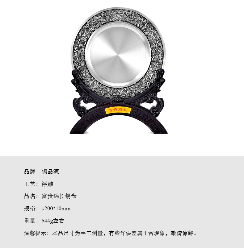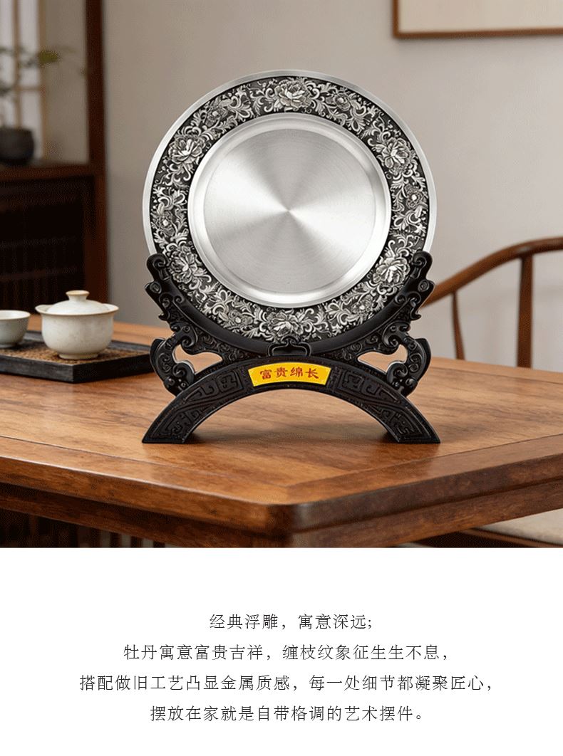 品 名:富贵绵长 规 格: φ200*10mm 重 量:544g左右 🌸 匠心臻品:纯锡一体打造,外圈满工錾刻缠枝牡丹浮雕,纹样雅致,寓意富贵吉祥。 ✨ 专属定制:盘心大留白支持激光 / 錾刻,可刻 LOGO、姓名日期,让每份礼物无可复制。 🎯 场景适配:适配乔迁、寿礼、商务颁奖等场景,不氧化耐腐蚀,兼具收藏与装饰价值。 📦 质感礼盒:配雕花实木架,开箱即摆,送礼体面有排面。