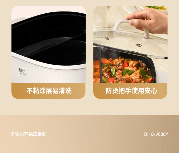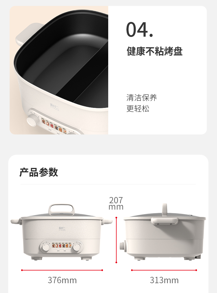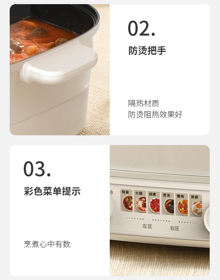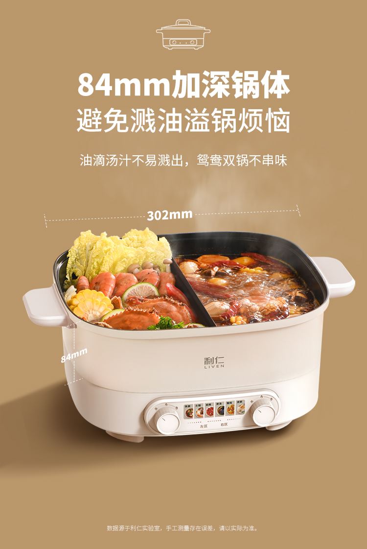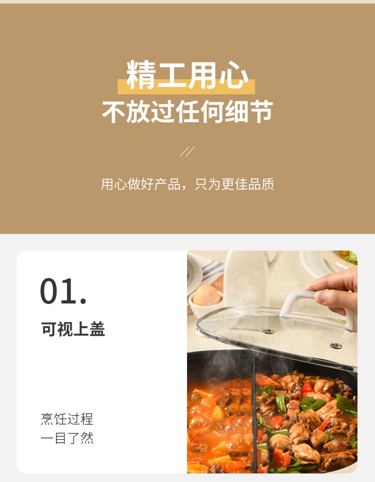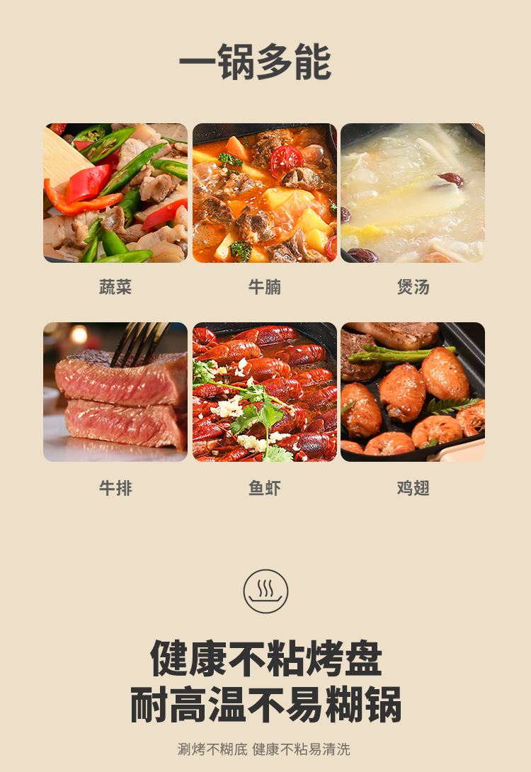 美味一锅搞定涮|煮|焖|煎|炒 五档火力温控调节,煎烤烙多重选择 84mm加深锅体避免溅油溢锅烦恼 可视上盖,烹饪过程一目了然 防烫把手,隔热材质防烫阻热效果好