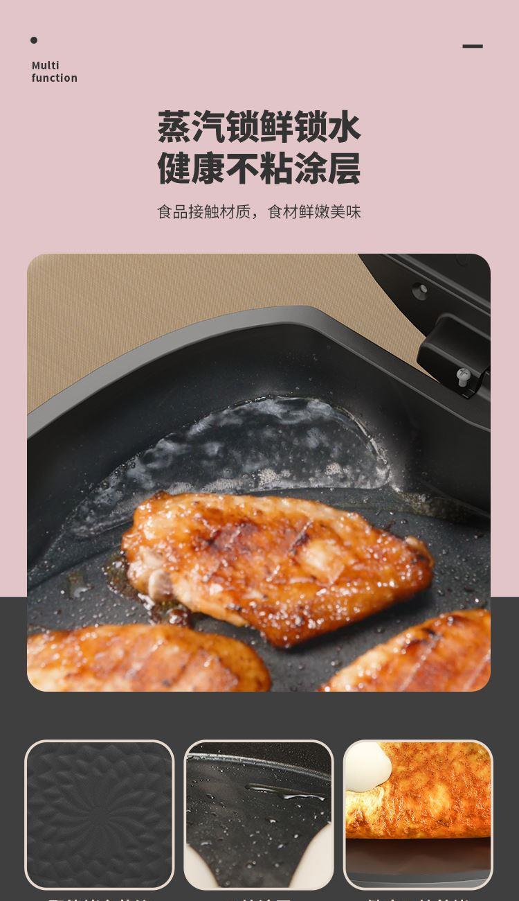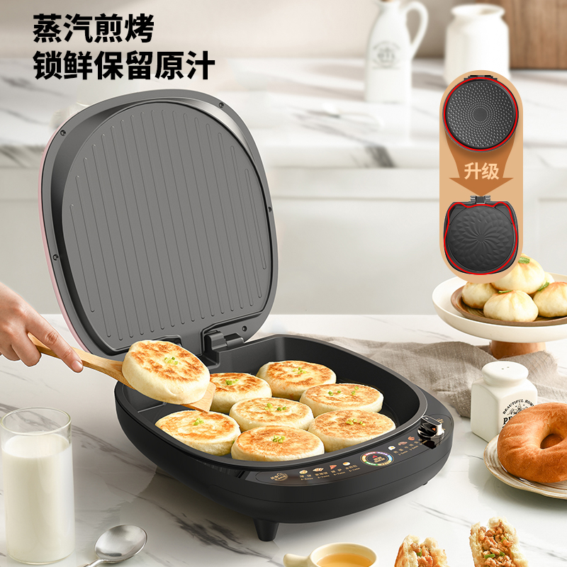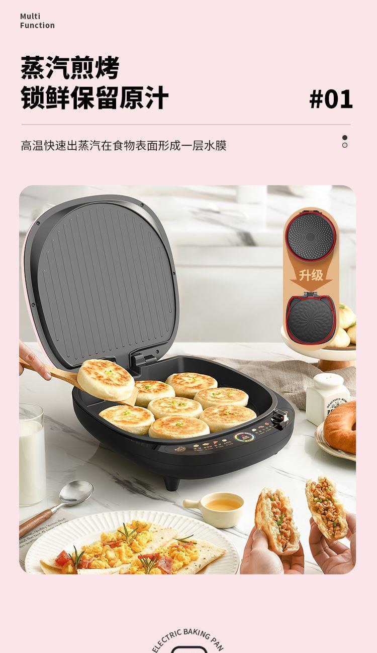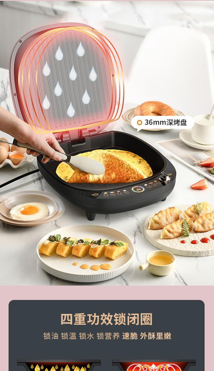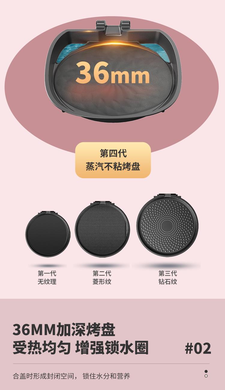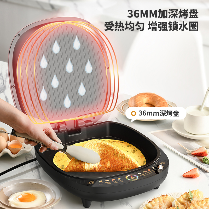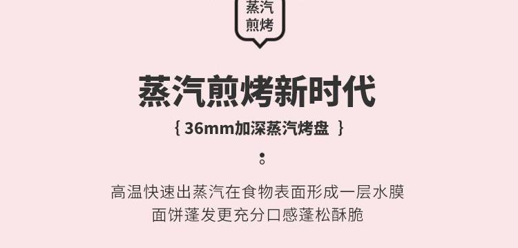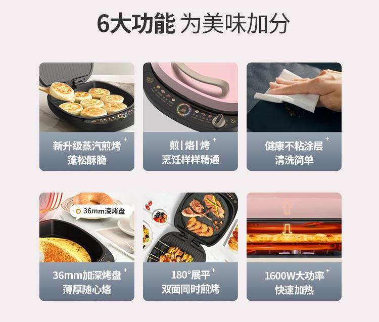 新升级蒸汽煎烤,蓬松酥脆 36mm加深烤盘,薄厚随心烙 180°展平,双面同时煎烤 1600W大功率,快速加热 健康不粘涂层,清洗简单
