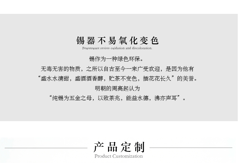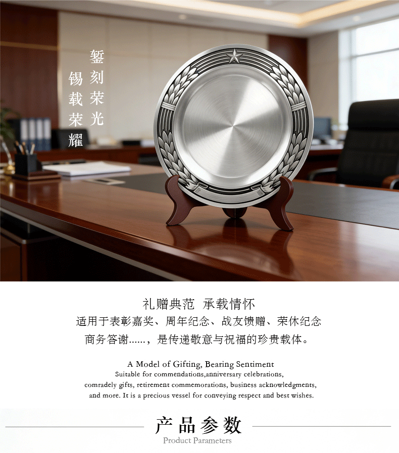 锡制材质,质感恒久:锡制金属光泽温润内敛,不易氧化变色,让荣誉与质感历经岁月仍熠熠生辉。
