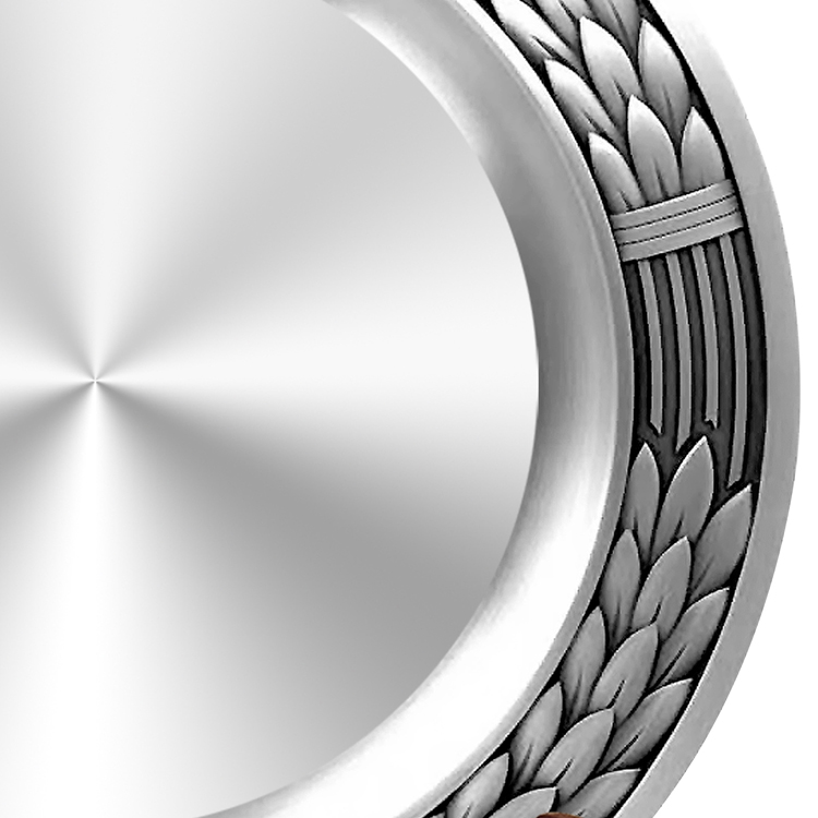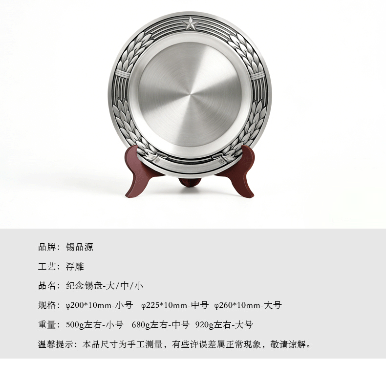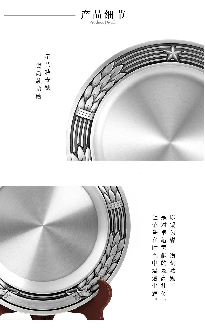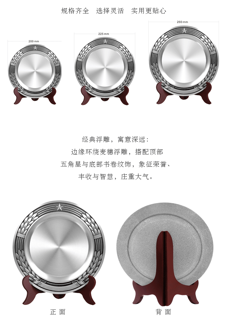 经典纹饰,寓意深远:边缘环绕立体麦穗浮雕,象征丰收与成就;顶部五角星彰显信仰与荣光,庄重大气。 匠心工艺,细节考究:立体錾刻工艺让纹理清晰饱满,盘面拉丝处理细腻,搭配实木支架,摆放稳固,尽显匠心品质与仪式感。