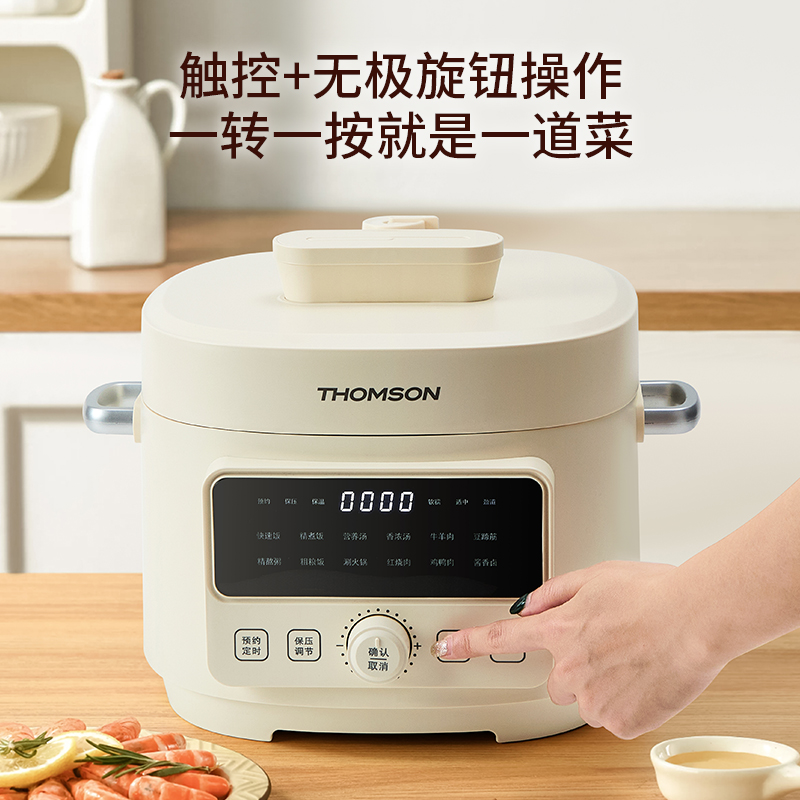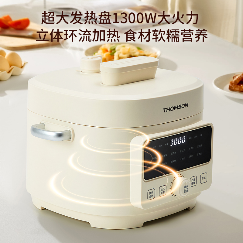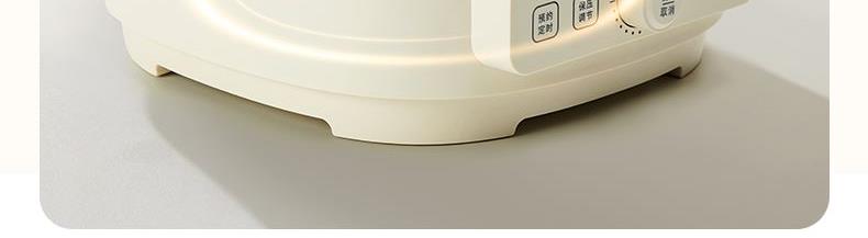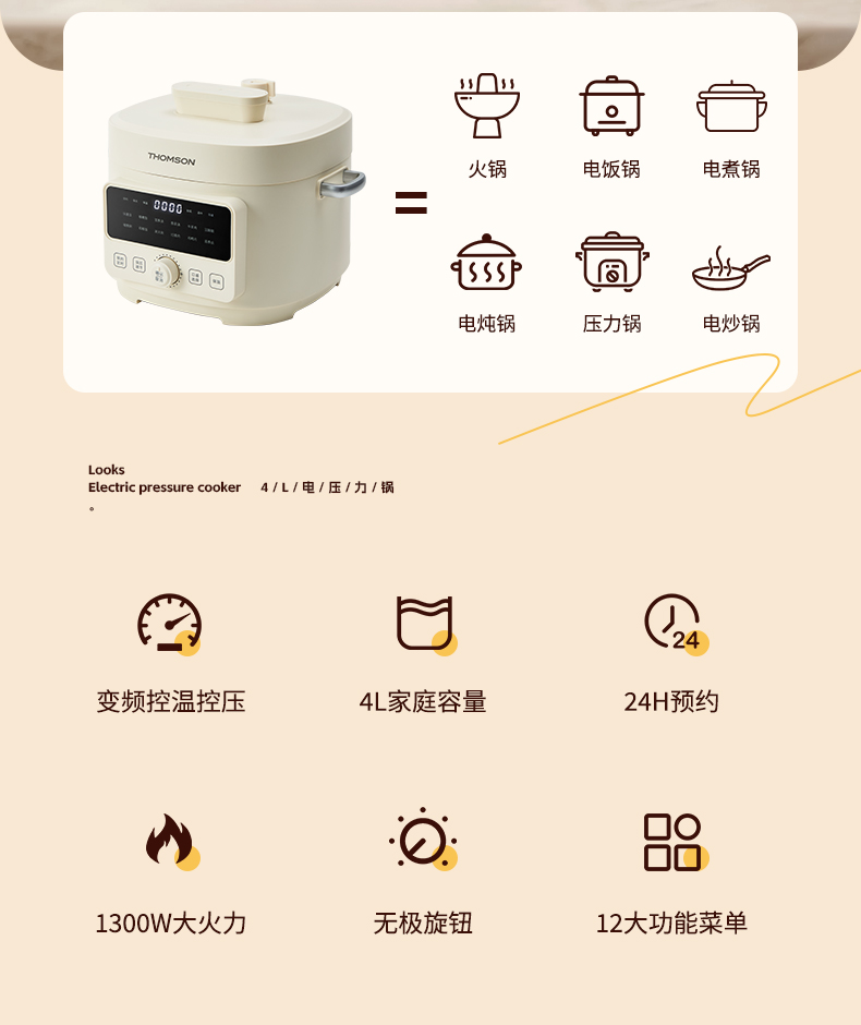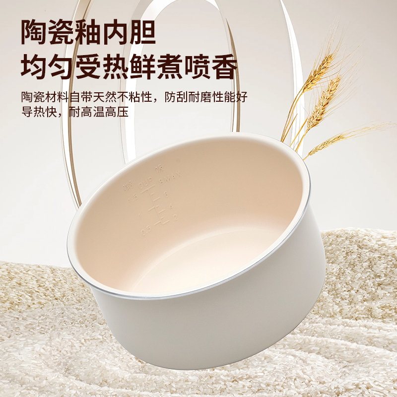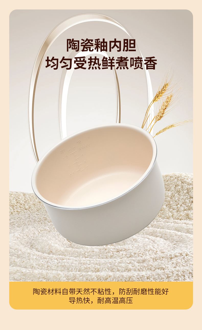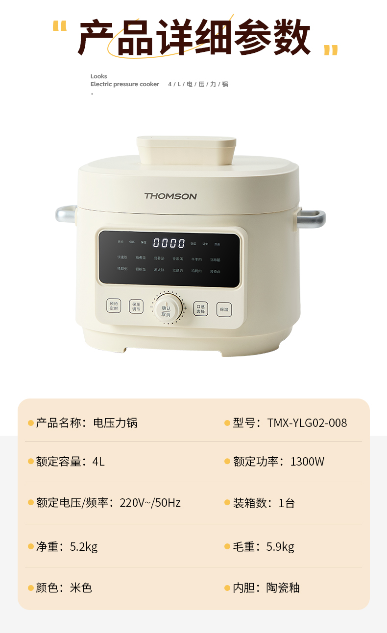 产品参数: 额定功率:1300W 额定电压:220V~ 额定容量:4L 额定频率:50Hz 产品净重:5.2kg 产品毛重:5.9kg 彩盒尺寸:368*368*288mm 外箱尺寸:383*383*308mm 产品卖点: 触控+旋钮控制; 70-80Kpa高压快煮,实物软糯入味; 陶瓷釉内胆:陶瓷材料自带天然不粘性,防刮耐磨性能好 超大发热盘1300W大火力;超宽电压100-270V。