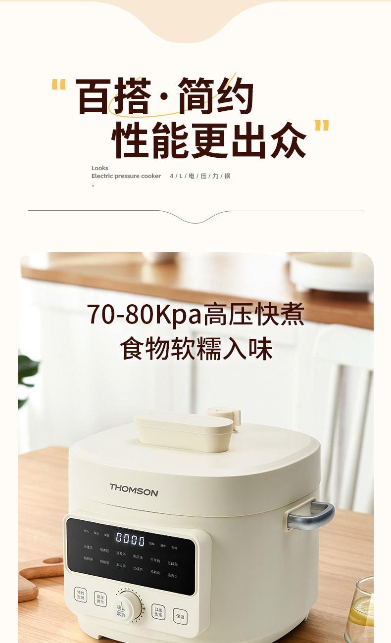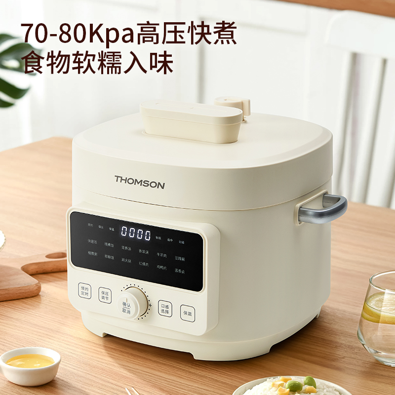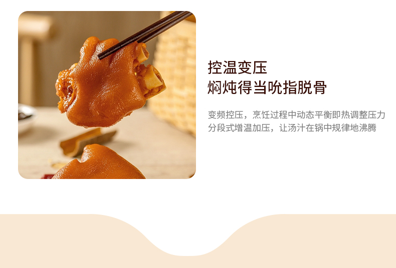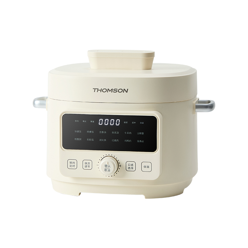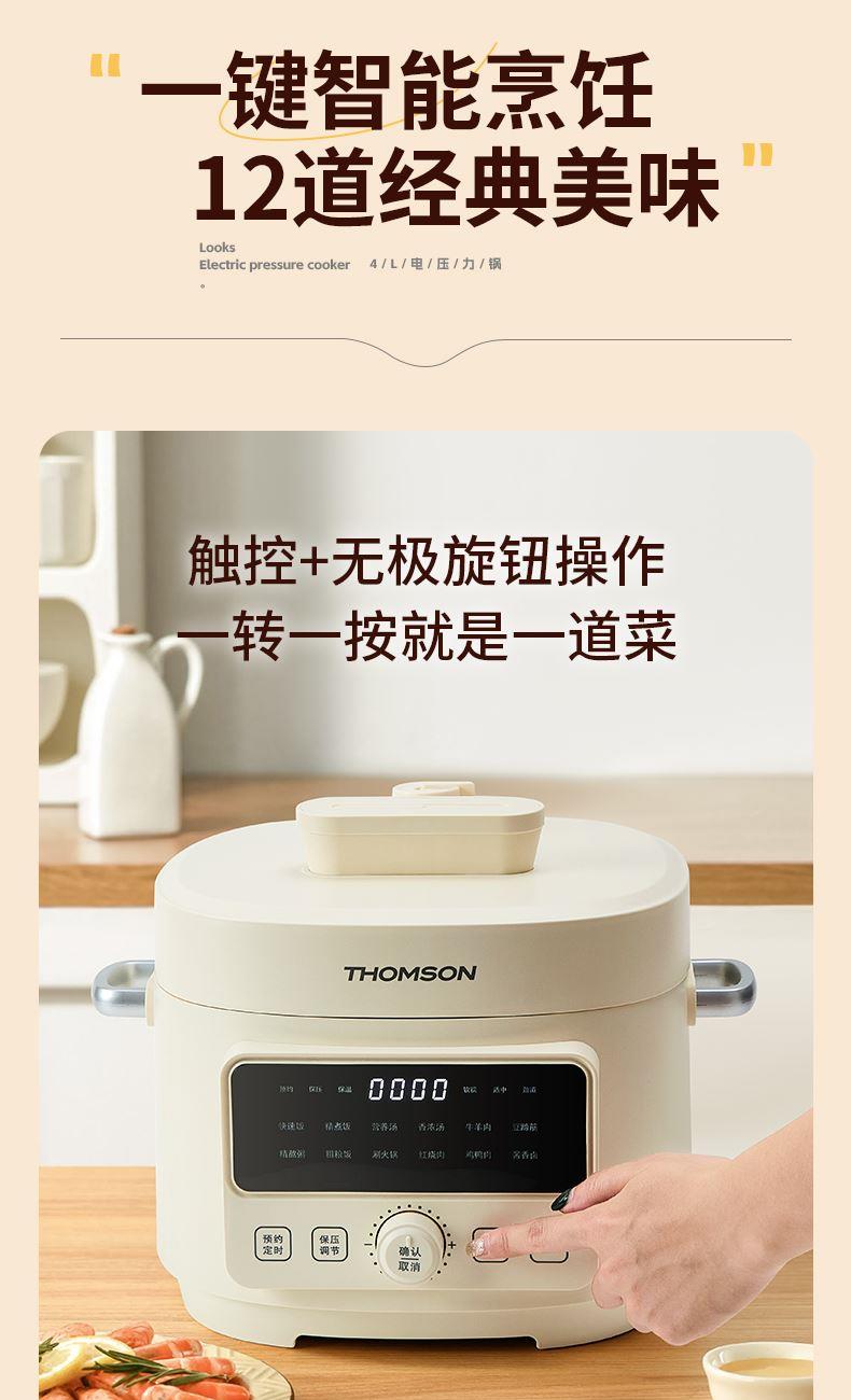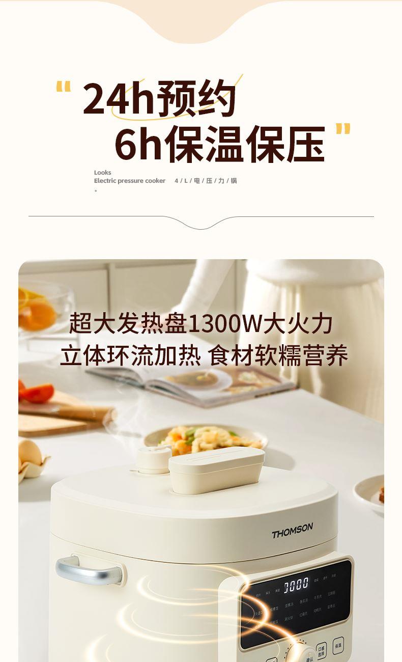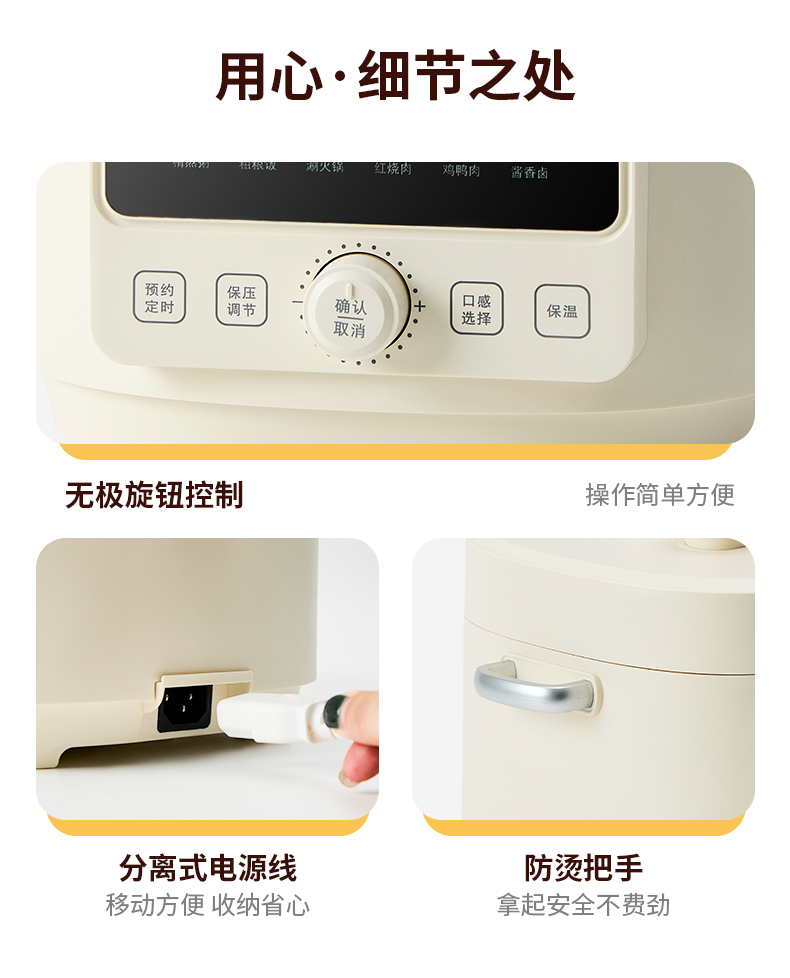 产品参数: 额定功率:1300W 额定电压:220V~ 额定容量:4L 额定频率:50Hz 产品净重:5.2kg 产品毛重:5.9kg 彩盒尺寸:368*368*288mm 外箱尺寸:383*383*308mm 产品卖点: 触控+旋钮控制; 70-80Kpa高压快煮,实物软糯入味; 陶瓷釉内胆:陶瓷材料自带天然不粘性,防刮耐磨性能好 超大发热盘1300W大火力;超宽电压100-270V。